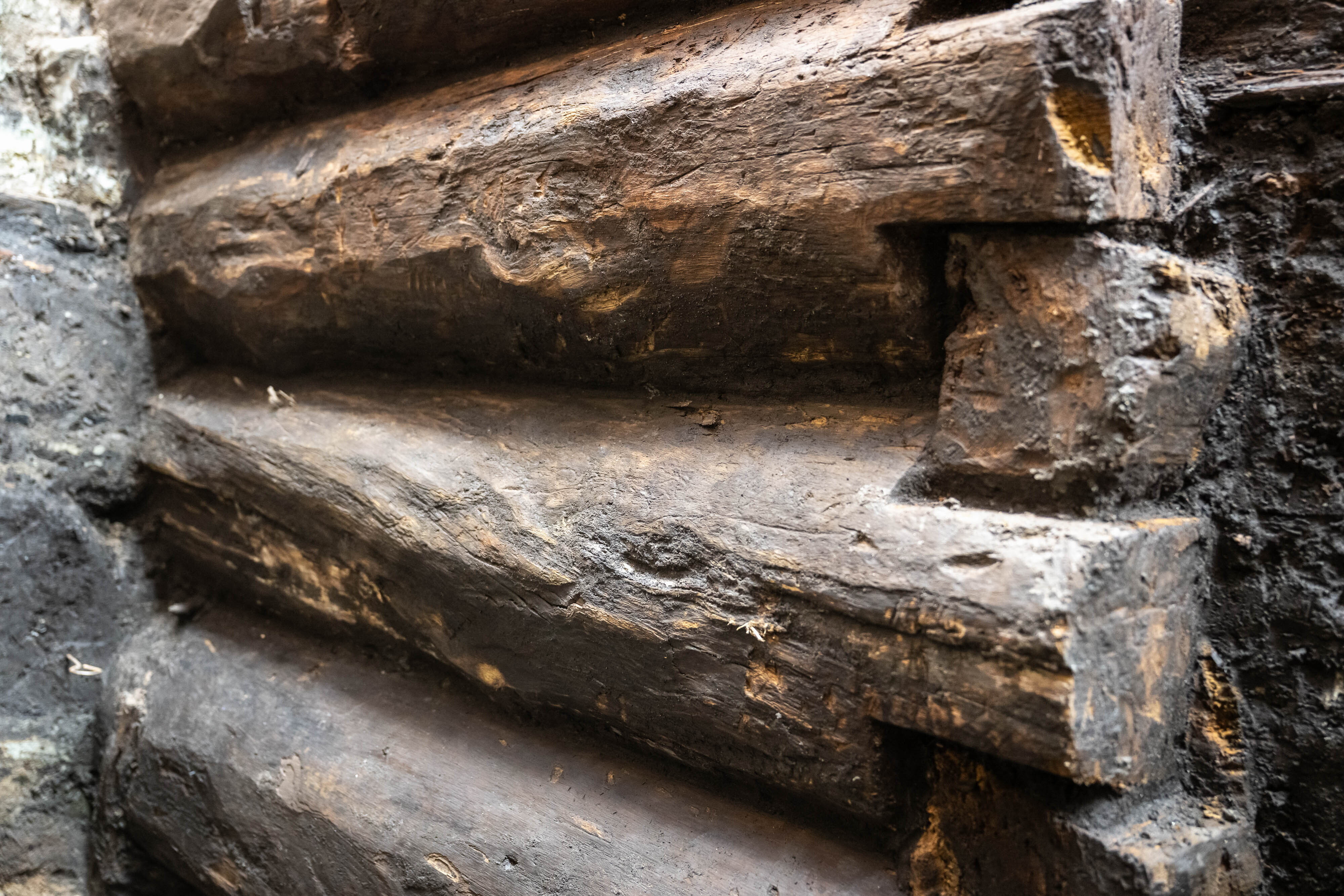 Jedna z odnalezionych drewnianych ścian ciągnie się pod obecnym murem okalającym Dom Mikołaja Kopernika i idzie dalej na zewnątrz.