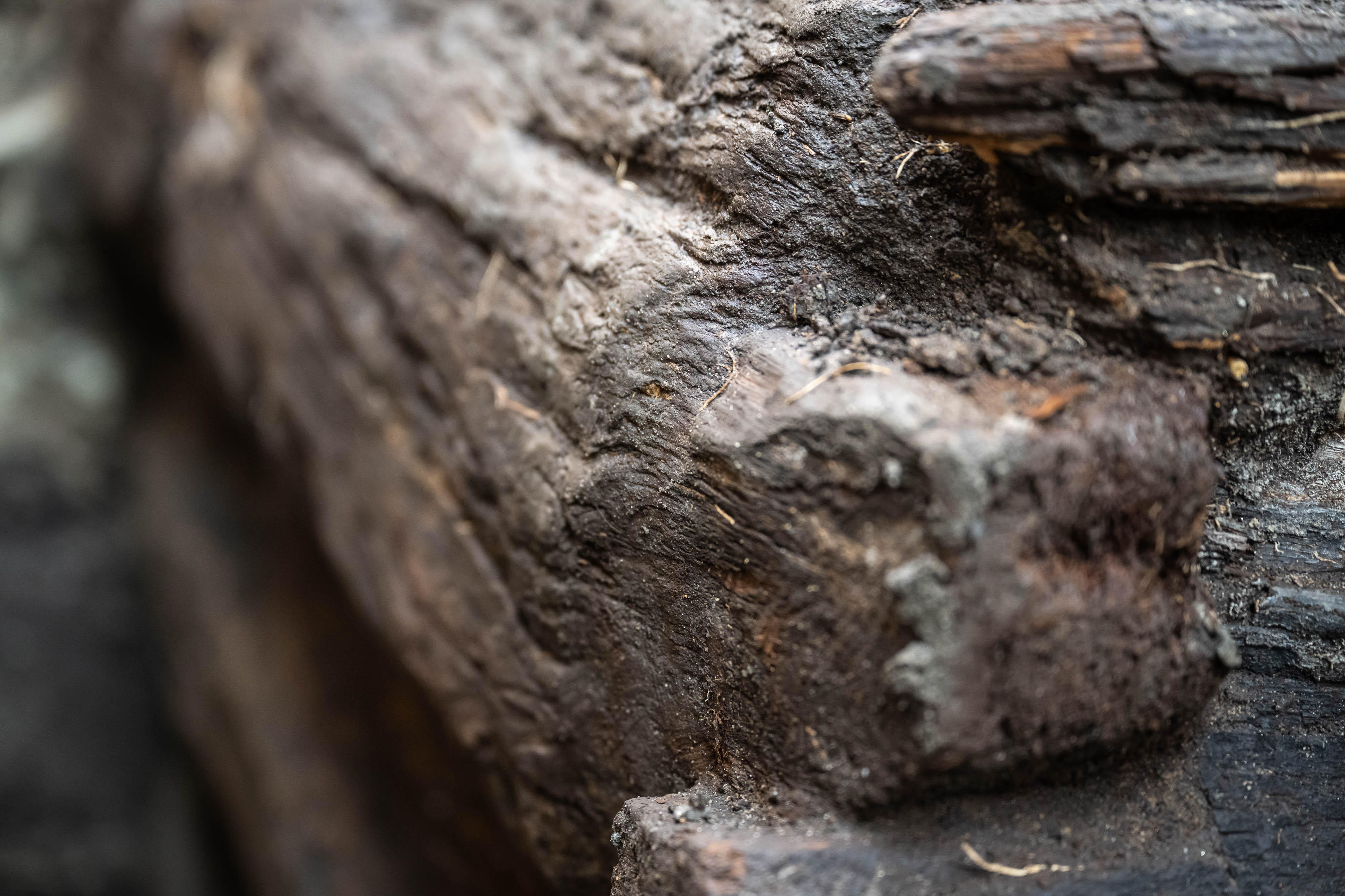 19.11.2025. Fragment nieznanych wcześniej drewnianych konstrukcji z XIII wieku w Toruniu. PAP/Tytus Żmijewski