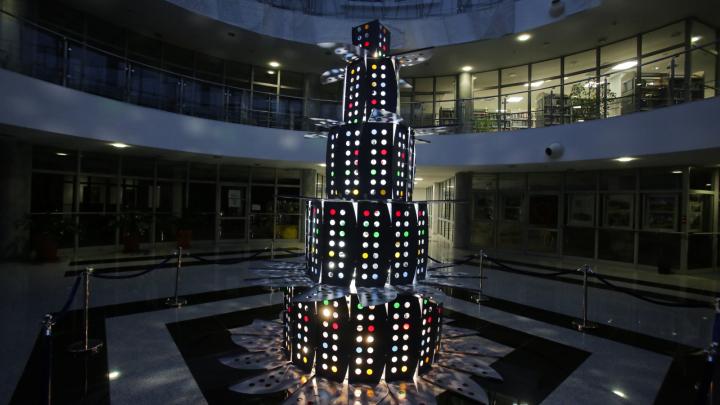 Na tegoroczne święta przygotowano konstrukcję z około 50 metalowych ograniczników do stolików, które w przeszłości oddzielały poszczególne stanowiska dla studentów korzystających z czytelni. Do budowy wykorzystano też m.in. kolorową folię, która podświetlona imituje bombki choinkowe. Elementy połączono ze sobą tzw. trytytkami. Choinka ma 4 m wysokości i 3 m średnicy u podstawy.