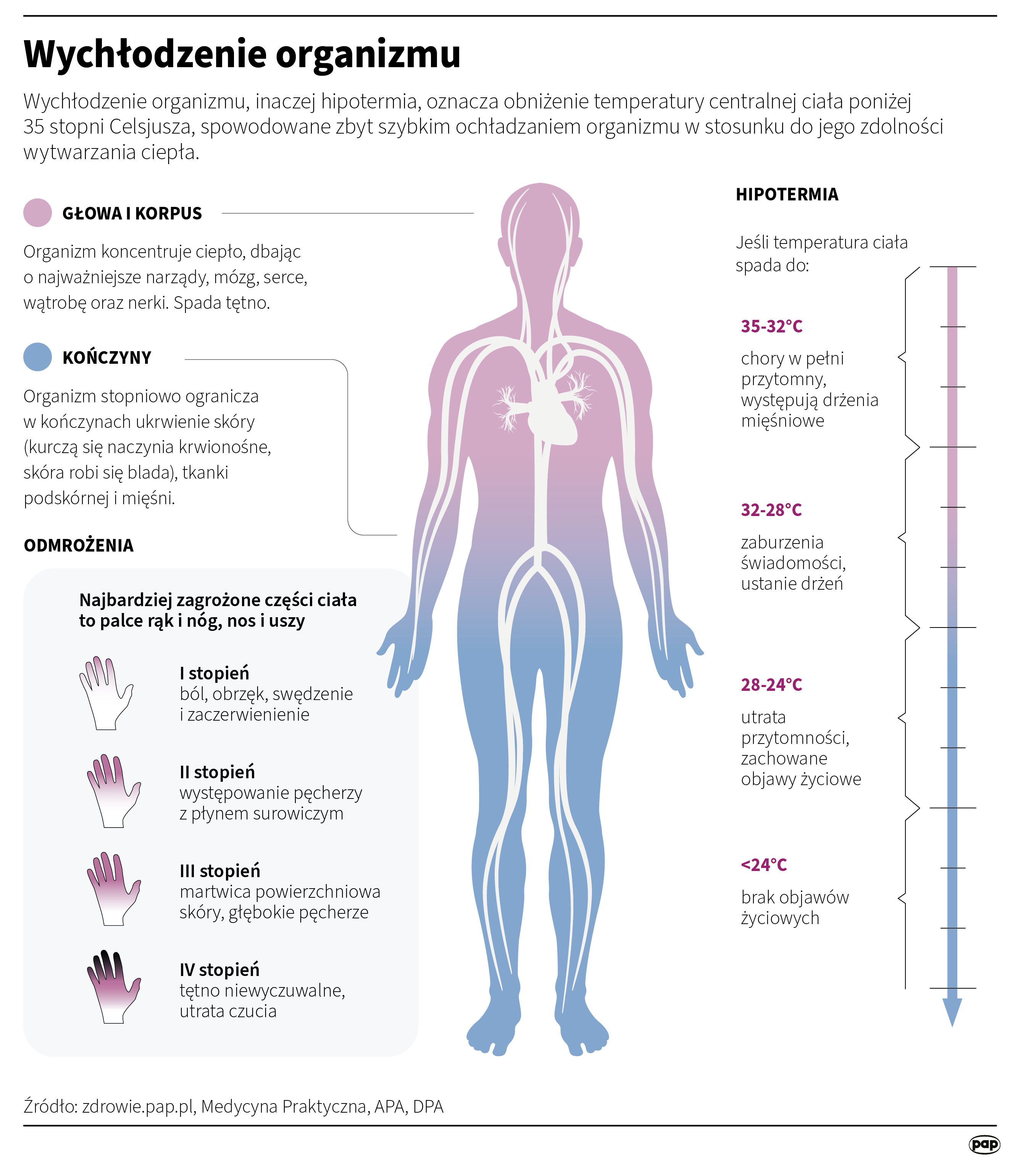 Jacek Wawrzynek, kierownik Zakładu Ratownictwa Medycznego Śląskiego Uniwersytetu Medycznego w Katowicach, przypomniał w rozmowie z PAP, że hipotermia to medyczne określenie sytuacji, w której organizm traci ciepło szybciej, niż potrafi je wytwarzać, co prowadzi do spadku temperatury centralnej ciała poniżej 35 st. C. Jak doprecyzował, takie wytyczne obowiązują dla medycyny ratunkowej, ale u pacjenta urazowego, np. potrąconego pieszego, o hipotermii mówi się już przy temperaturze poniżej 36 st. C.