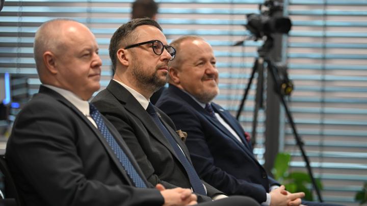 27.01.2026. Dyrektor NCBR prof. Jerzy Małachowski (P), wiceminister nauki i szkolnictwa wyższego prof. Marek Gzik (L) i minister nauki i szkolnictwa wyższego Marcin Kulasek (C) podczas konferencji prasowej Narodowego Centrum Badań i Rozwoju nt. „Program dla młodych naukowców w nowej odsłonie – rusza LIDER UP”, 27 bm. w budynku Varso Tower w Warszawie. PAP/Marcin Obara