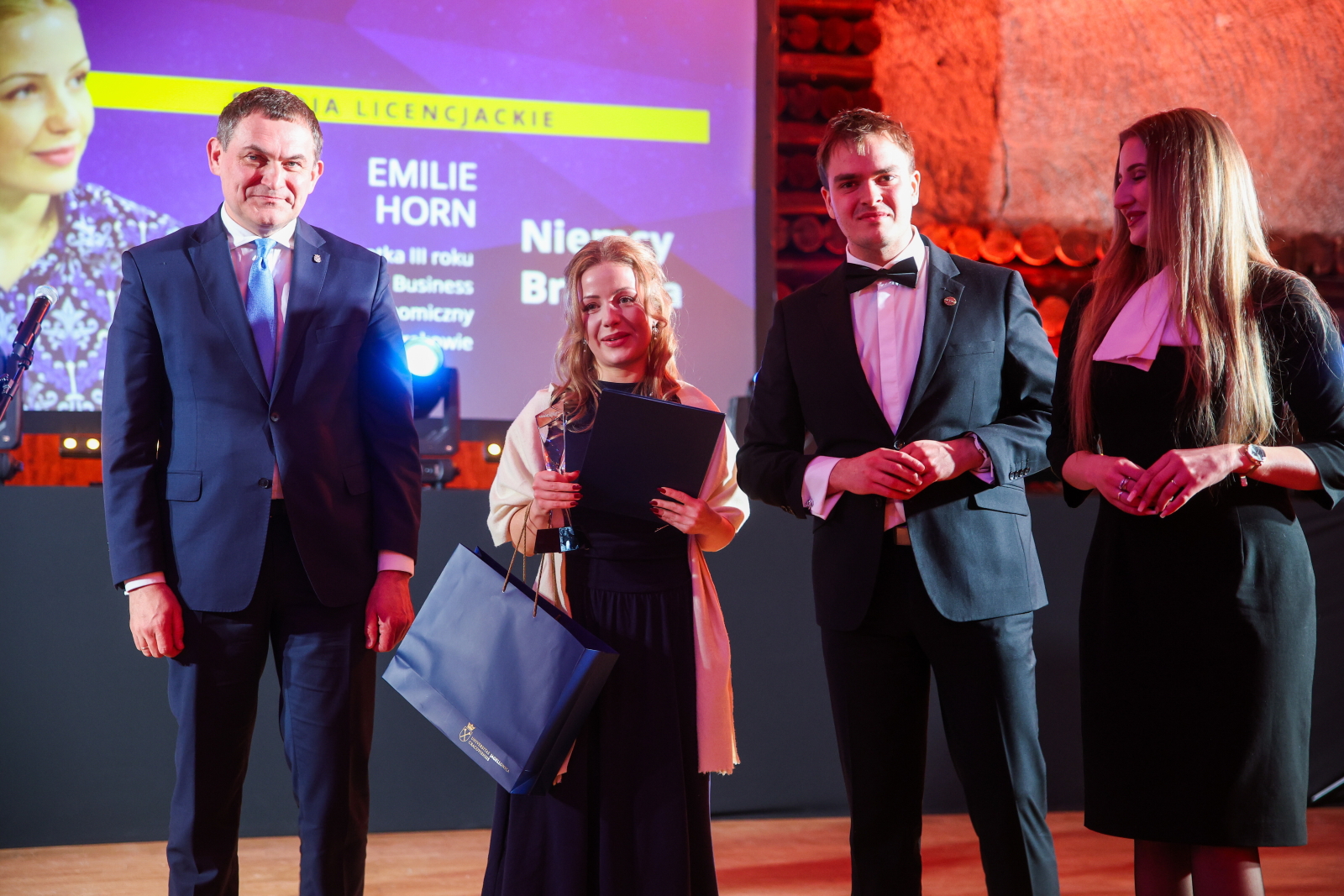 29.01.2026. Rektor UJ prof. Piotr Jedynak (L), przewodnicząca Parlamentu Studentów RP Julia Bednarska-Leśniak (P), przewodniczący Krajowej Reprezentacji Doktorantów Rafał Ramut (2P) oraz nagrodzona w kategorii studia licencjackie Emilie Horn (2L) podczas gali nagród „Gwiazdy Umiędzynarodowienia 2026” i INTERSTUDENT 2026, 29 bm. w Kopalni Soli „Wieliczka”. Nagrody, przyznawane od 2018 roku, są przeznaczone dla osób mających wybitne osiągnięcia w działaniach na rzecz internacjonalizacji polskich szkół wyższych. (mr) PAP/Łukasz Gągulski