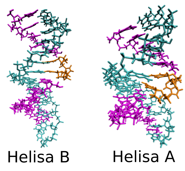 Różnice w budowie helis DNA i RNA determinują ich łatwość namnażania się. Mamy dwa główne typy helis: helisa typu B jest typowa dla DNA, a helisa typu A typowa dla RNA jest bardziej ściśnięta i skondensowana i łatwiej samoreplikuje się nawet bez udziału enzymów. Autorka: Barbara Lech.