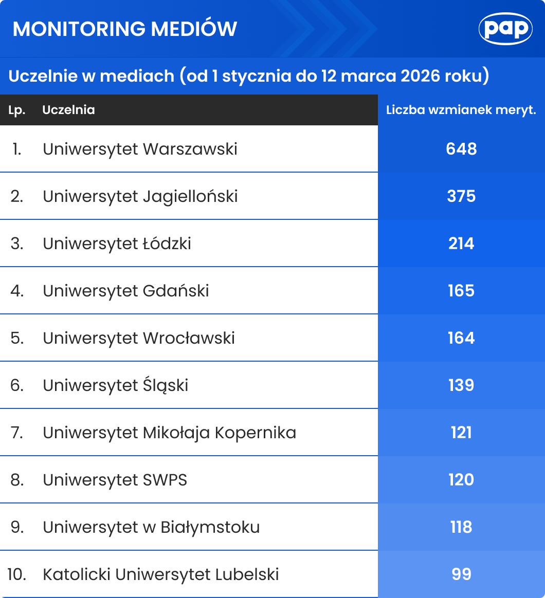 Raport na temat medialnej obecności 24 uniwersytetów, uwzględnionych w Rankingu Szkół Wyższych Perspektywy 2025, przygotował Zespół Monitoringu Mediów PAP. Zestawienie obejmuje okres od 1 stycznia do 12 marca br.