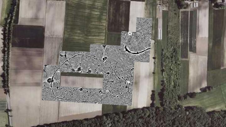2/4Osada obronna kultury trzcinieckiej ze starszej epoki brązu; na zdjęcie lotnicze nałożono wyniki badań geofizycznych, oprac. M. M. Przybyła