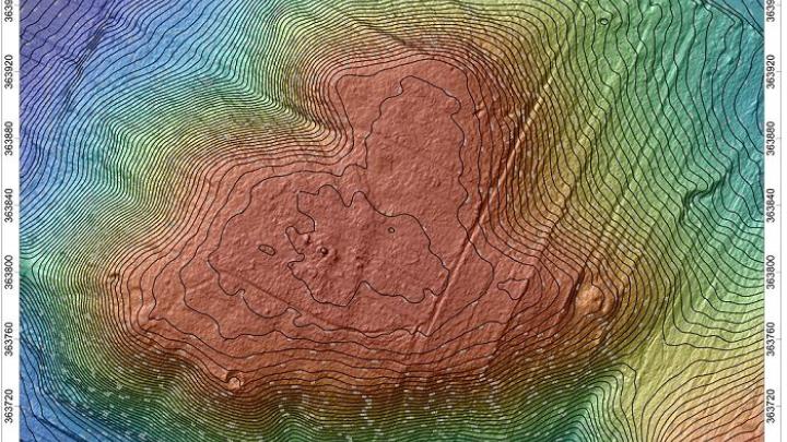 4/5Plan wzgórza powstały dzięki zastosowaniu lotniczego skanowania laserowego. Dwie linie wałów widoczne są w centralnej części wzgórza; oprac. A. Kubicka -